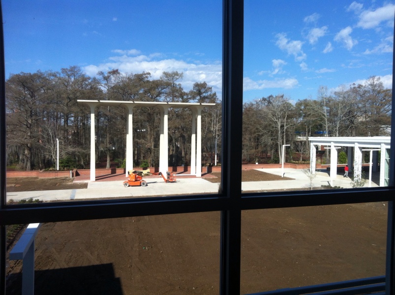 Views from the second floor hallway connecting the two wings. Great views of the courtyard/cypress lake. To the right are a bunch of conference rooms, as well the new Forum.