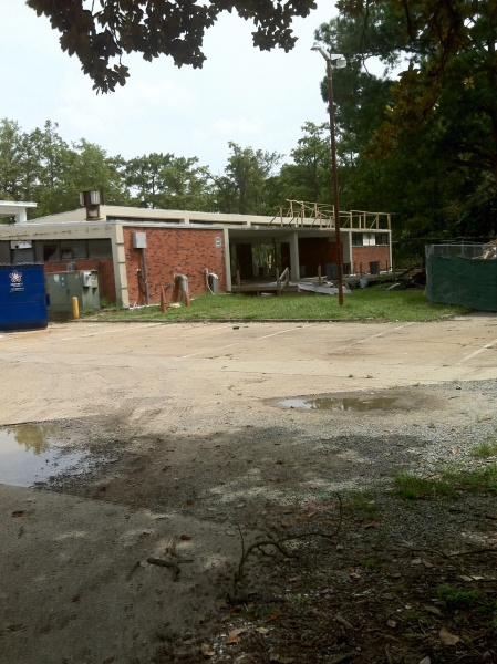 Big pile of debris behind what was Corona Hall. They will haul this off first before they start to demolish the structure. They salvage what they can, recycle what they can't salvage and dispose of the rest. Since the building is concrete they will haul the broken concrete to Scott and crush it to use as aggregate. They need to have the concrete as free of other material as possible to make a good crush run.