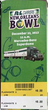 I am looking for a couple used ticket stubs for the New Orleans bowl game played 12/22/12. For your trouble, I will send you $10 for each ticket. I am just a bowl game ticket stub collector. Email me giff@comcast.net and we can make arrangements. I want the graphic art type. Thanks for your help.