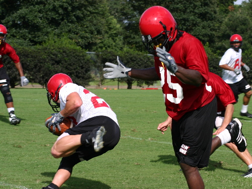 The team worked 11 periods followed by a conditioning exercise. The final period featured a 12-play team drill in which the offense battled the defense for the first time this fall.
