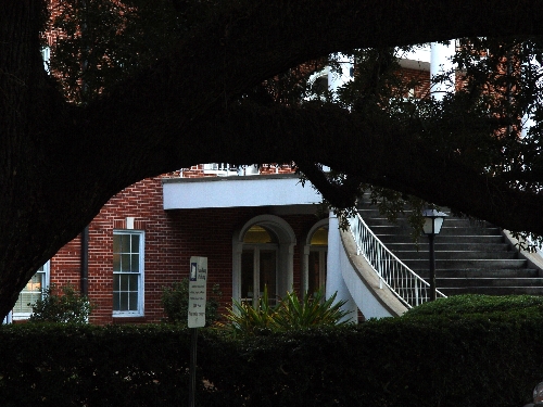A view of Martin Hall from under an oak