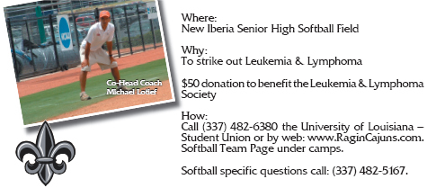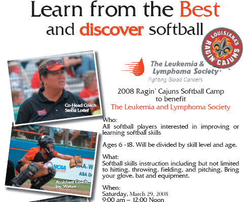 The 2008 Ragin’ Cajuns softball team will hold a camp to benefit the Leukemia and Lymphoma Society will be held on Saturday, March 29 at New Iberia Senior High School.