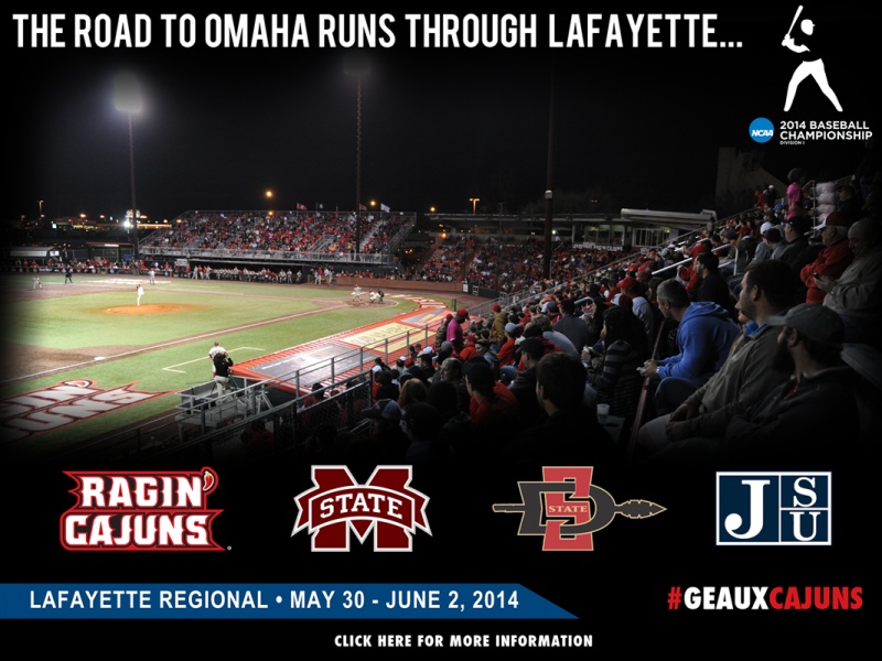 The Louisiana Ragin' Cajuns will play host to the NCAA Lafayette Regional at M.L. "Tigue" Moore Field Friday when the Cajuns meet Jackson State at 6 p.m. in the nightcap of the first day. San Diego State will face Mississippi State at 1 p.m. Friday in the opening game of the four-team regional.