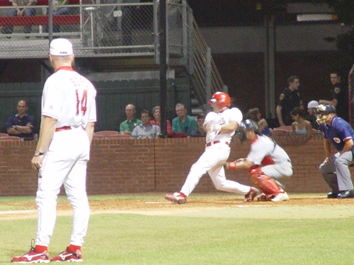 Pinch hitter Brad Saloom made his only chance count in the 9th as he doubles down the line in right off the glove of Nicholls 1st baseman.