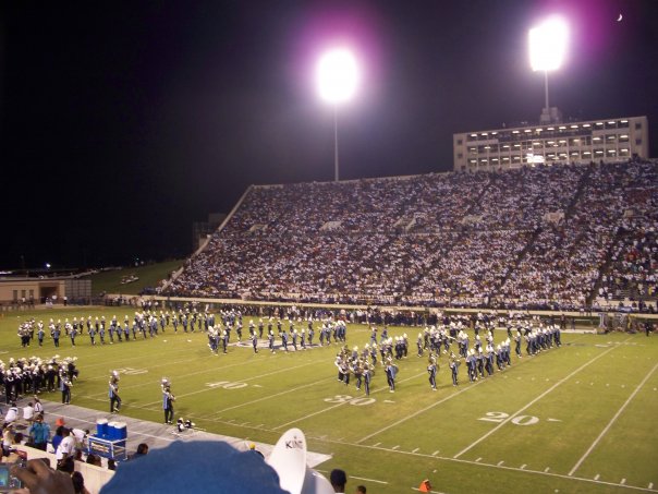 I went to the Southern University vs Jackson State University game last year on October 4, 2008 and took a couple of pictures of the Southern fan base. This game was in Memorial Stadium in Jackson, Mississippi and it's a horse shoe shaped stadium it was standing room only. These guys are serious about following their football team! That's their band in the second picture walking up the ramp with the gold capes. It will be a good and exciting game.