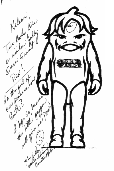 Ken Ardoin who at the time was on the UL Athletic Advisory Committee, tried to tell Nelson (through fax) that the concept looked like the Jolly Green Giant and subtly sent the message of distain by asking "is this part of our penance on earth?" Predicting it would cause UL (us) pain.