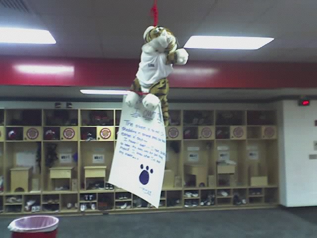 This is from 2006 when we played LSU. I took this before our Friday walk through. It is mike the tiger hanging from a noose with a suicide note. Thought it would be fun to share. Also one of my teammates at the time had "Pi** on LSU" buttons made lol. GEAUX CAJUNS