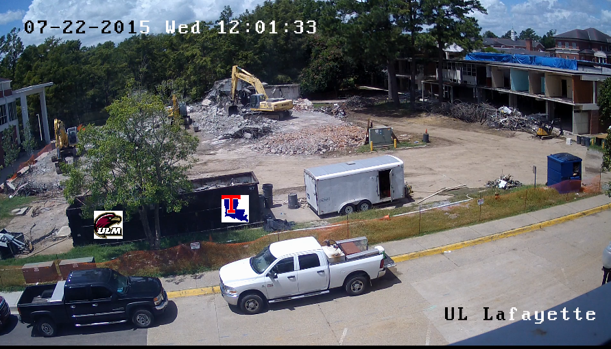 The University of Louisiana has set up a live camera overlooking the demolition on Hebrard Boulevard. Guillory, Lafayette, and Vermilion halls (previously Coronna and Olivier) are coming down to create new green space on campus.