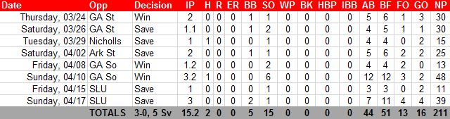 15.2 IP, 2 H, 0 R, 0 ER, 5 BB, 15 K