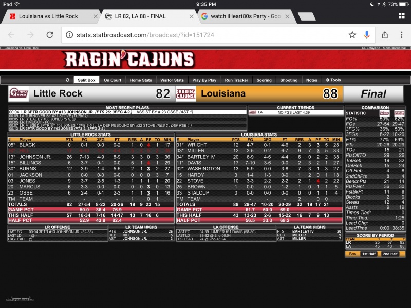 Cajuns make their last eight free throws to help them hold on. They deserve credit for coming through in the clutch. As disappointed as we are with the way the game ended, the guys deserve credit for playing a complete game until that point. Note 6 guys were in double figures, they had lots of assists, and they outrebounded the Trojans handily despite Washington sitting out the end of the game. Agree officials aided the Trojan comeback. For example a ridiculous jump ball was called when Stove had the ball corraled with 5 seconds to go rather than an obvious foul. As the Trojans had the possession arrow, that allowed a 9 point game to become the 6 point final margin. Still the problems the Cajuns had with the press and trap late are a concern. Bryce Washington did not play the last eight minutes due to sore knees and it is obvious they missed his leadership and team guidance. If he is not good to go on Monday night, they will have little chance to be successful as Ark. State is a much better team than Little Rock. Still, 14 an 7 at this stage is better than most of us would have predicted back in the summer. That does not mean finishing poor here won't be disappointing. Let's hope the treatment Bryce gets tomorrow will allow him to go all out on Monday night.