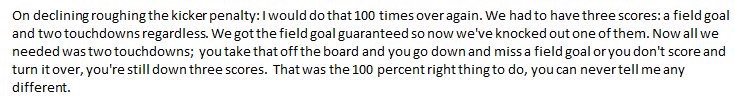 Did y’all happen to catch his reasoning for declining the 15 yard roughing he kicker penalty?
