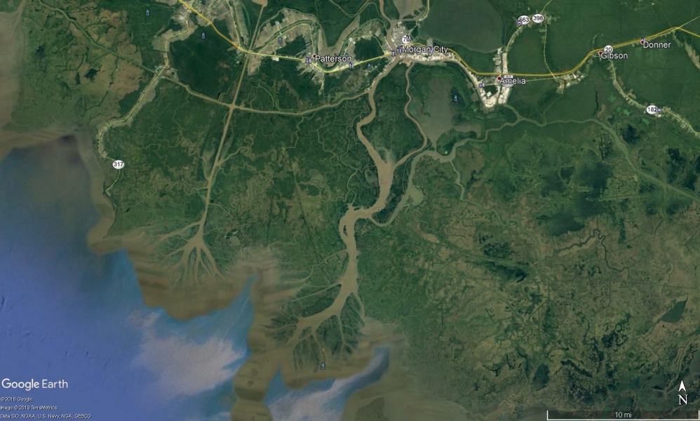 Today, with the river's course harnessed, most of that sediment is no longer making its way westward and is instead being dumped off the contintental shelf into deep water. I think Wax Lake Outlet is about as far west as Miss River sediment now makes it via the Morganza Spillway.