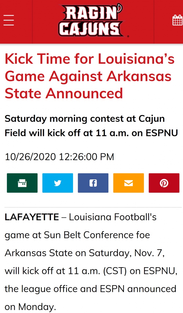Louisiana Football's game at Sun Belt Conference foe Arkansas State on Saturday, Nov. 7, will kick off at 11 a.m. (CST) on ESPNU, the league office and ESPN announced on Monday.