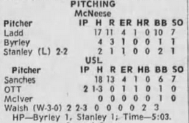What is even more amazing, the starting pitcher for McNeese (Ladd) went 17 innings, and the Cajuns' starter David Sanches went 18 innings.