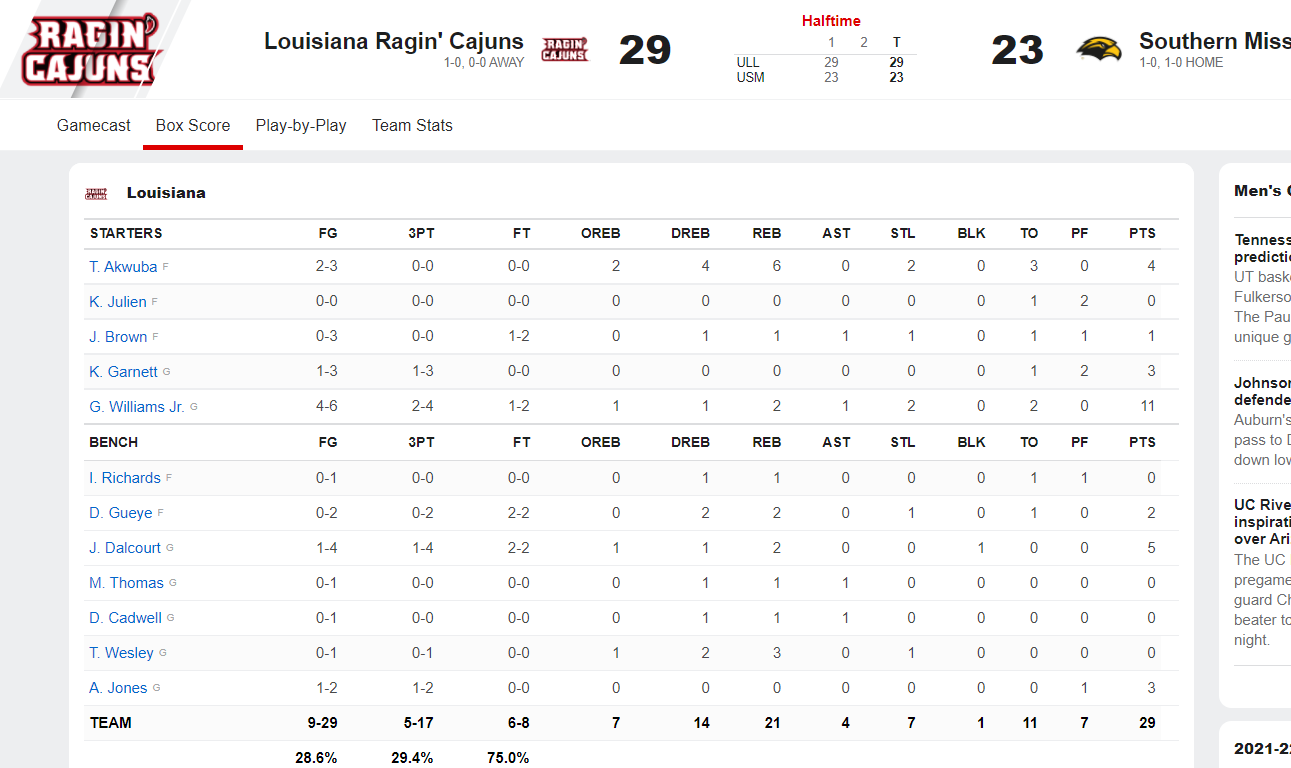 29-23 Cajuns at half