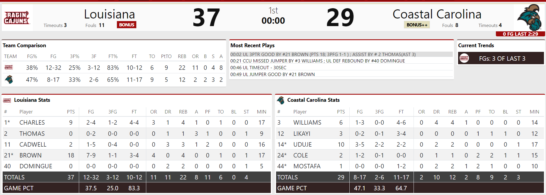 Jordan Brown with a 3 at the buzzer and UL has an 8 point lead at half. Looking good.