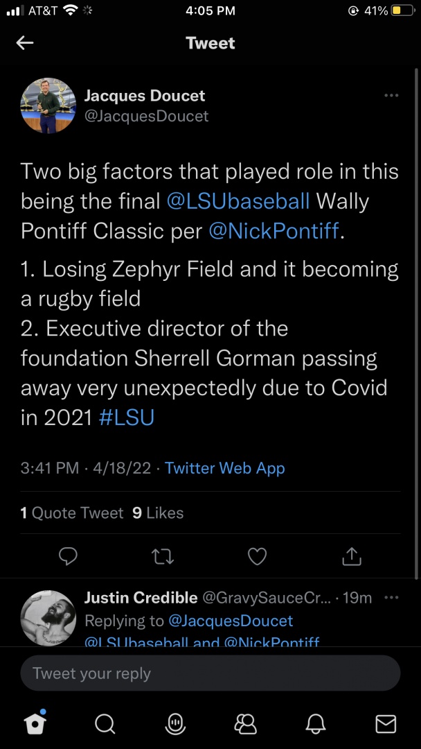 You hate to see that event die especially for such a tragic cause. That is something I could not imagine going through as a parent. In an effort to not be a hypocrite, full disclosure here, I thought Wally Pontiff was an arrogant cocky little pr!ck as a player. Make no mistake about it he was 100% responsible for what took place at that BR regional, that eventually lead to Aaron Hill throwing his bat into the Cajun dugout, and the series being put on hiatus for several years. He was the $h!+ stirrer if you will. Even with all of that as a Cajuns fan I mourn his lost and my heart aches for his parents and siblings.