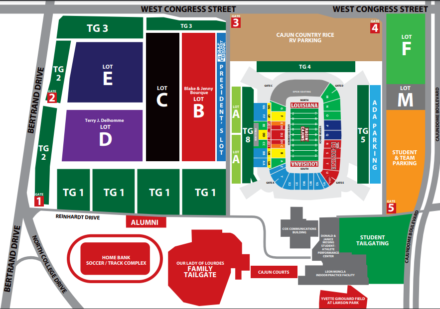 When we consider attendance, we need to start setting annual goals. We aren't going to go from averaging 15,000-18,000 in attendance annually to 25,000 to 30,000 overnight. Seating capacity at Cajun Field is 41,426, we're currently averaging less than 50% capacity. 18,000 in attendence is 43.45%. I attached a map of Cajun Field below, currently we have a lot of space allocated to tailgating and premium parking that goes unused. The casual or potential fan passes by Cajun Field and the visual message they receive is this isn't a place to be. If you want to build excitement and attendence, you must start at Cajun Field and get people within the fences. That means reallocating tailgating and parking in a way that gets space filled. I'd be willing to bet a substantial portion of this unoccupied space doesn't generate revenue, so we need to think carefully about the value of this space and what the average individual is willing to pay to park/tailgate. Again, you must look at it from the aspect of $0 in revenue. We're in a long game here, where we start is going to be less than what we would like to charge and then over time and with demand we increase accordingly. Again, the visual you want to create within the fences is a full house.