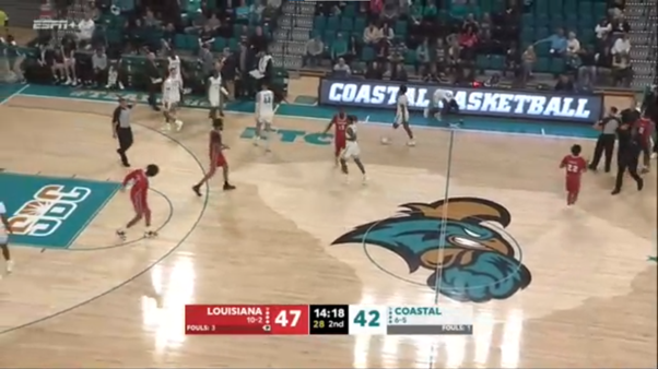 dalcourt nails a 3 without a shoe on. Cajuns up by 6