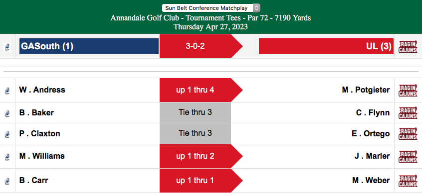 Got 4 scores all 3 rds of stroke play and clutched up this morning. Really happy for Theo and his guys. Hopefully they can play well this afternoon. Ga Southern is really good (their #1..Carr played in the Masters a couple weeks ago).