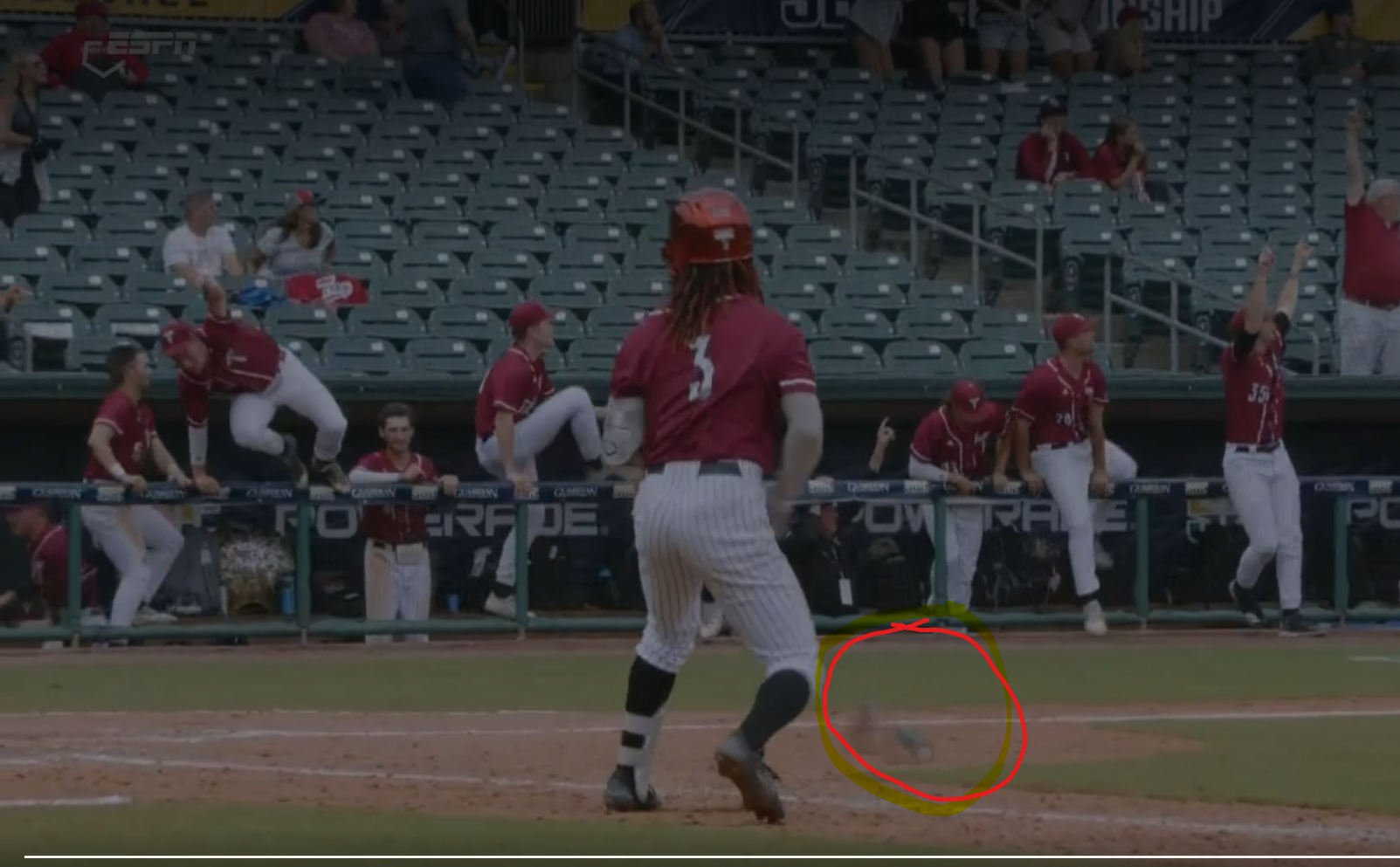 Here are two of the still frames of him throwing the bat back into the field of play. If you want to watch it in real time you can go to espn.com and watch the replay at 3:08 marker