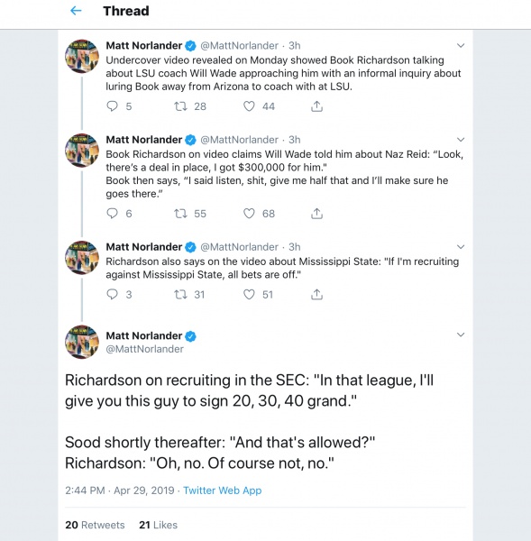 Per the Bleacher Report, testimony from ex-Arizona assistant Book Richardson indicates he had conversation with Will Wade regarding the recruitment of Naz Reid. On tape he says Wade offered him a job to land Reid and had $300k to get it done....for specific excerpts from Richardson’s testimony, refer to today’s Bleacher Report as per Yahoo’s Dan Wetzel. Supporters in Refineryville despise this guy...and the thunderous beat goes on...
