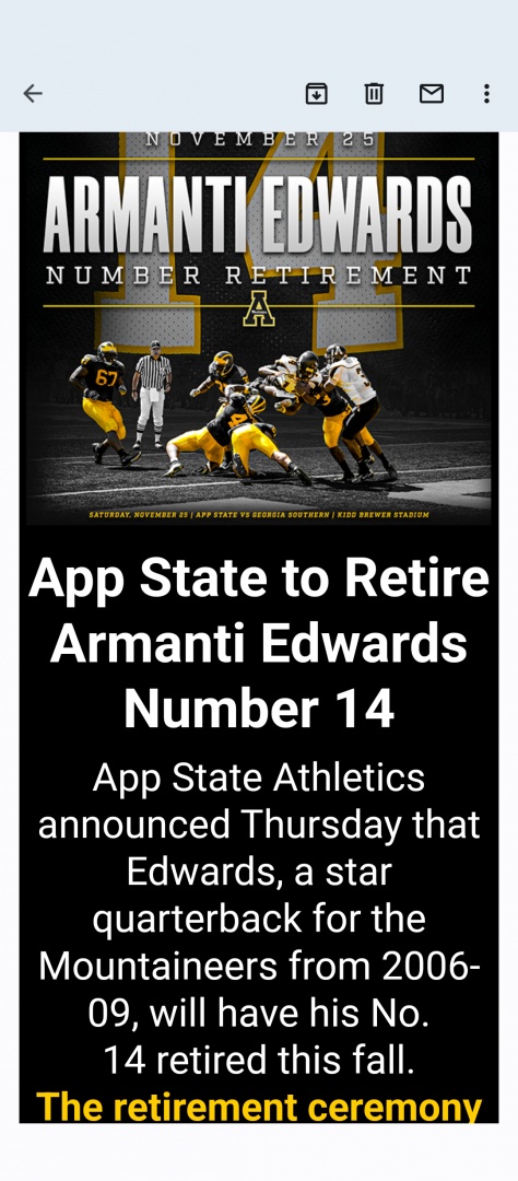 The honoring of Edwards' No. 14 is the last time App State plans to take a jersey number out of circulation due to limited inventory of jersey numbers for the roster each season.