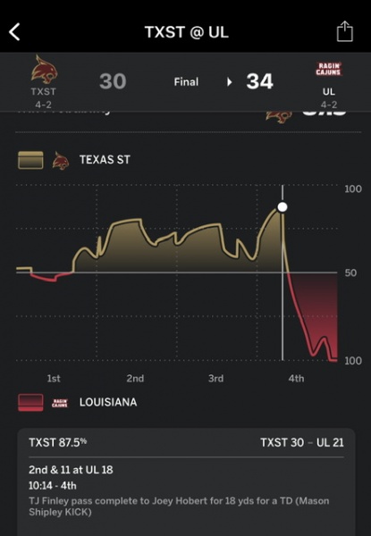 After struggling most of the afternoon to slow down Texas State's high-octane offense, UL's Ragin' Cajun defense forced two turnovers and had a blocked punt on the Bobcats' final four possessions at Cajun Field Saturday afternoon. Those stops helped set up Cajun quarterback Zeon Chriss, who accounted for two touchdowns in the final 5:54 to rally UL from as much as a 13-point deficit and to a 34-30 Sun Belt Conference victory, their 11th in 11 tries against the Bobcats.