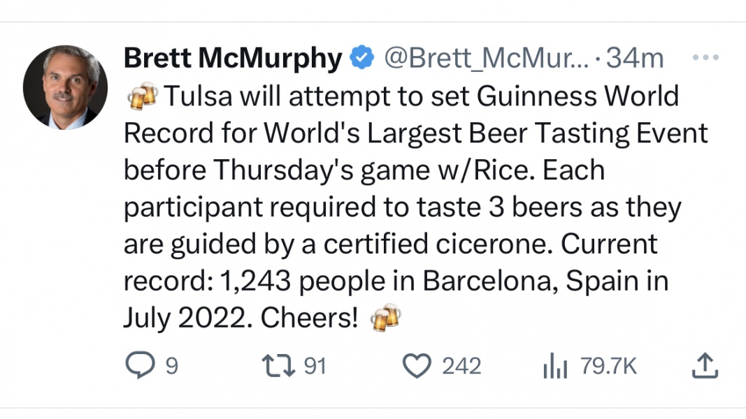"Participation in the world record attempt is free of cost. Reduced-priced tickets to the football game, tickets to Oktoberfest and a limited supply of University of Tulsa steins are available for purchase at TUBreaksRecords.com"