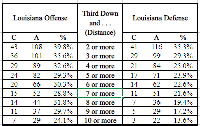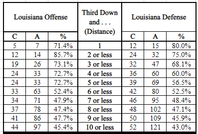 Louisiana Defense allowing an average of 4.21 yards per 3rd down play (15th lowest in FBS, 2nd lowest in SBC after Troy (4.02))