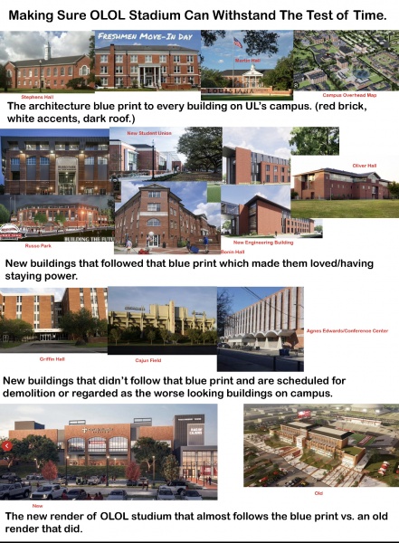 I believe building sustainability is achieved is through how much architectural uniformity a new campus building has compared to what is already established. When I think of UL buildings, there are three major characteristics I deem vital: red brick, white accents, and a dark roof. That last one is what is missing from OLOL stadium.