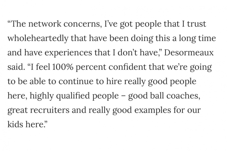 Coach Des’ connections are questionable if he thinks this is a collection of coaches who can produce winning football. He also needs to stop calling his team, kids. They are adults now and deserving of respect. They are student athletes, who want to get paid for their talent and services.