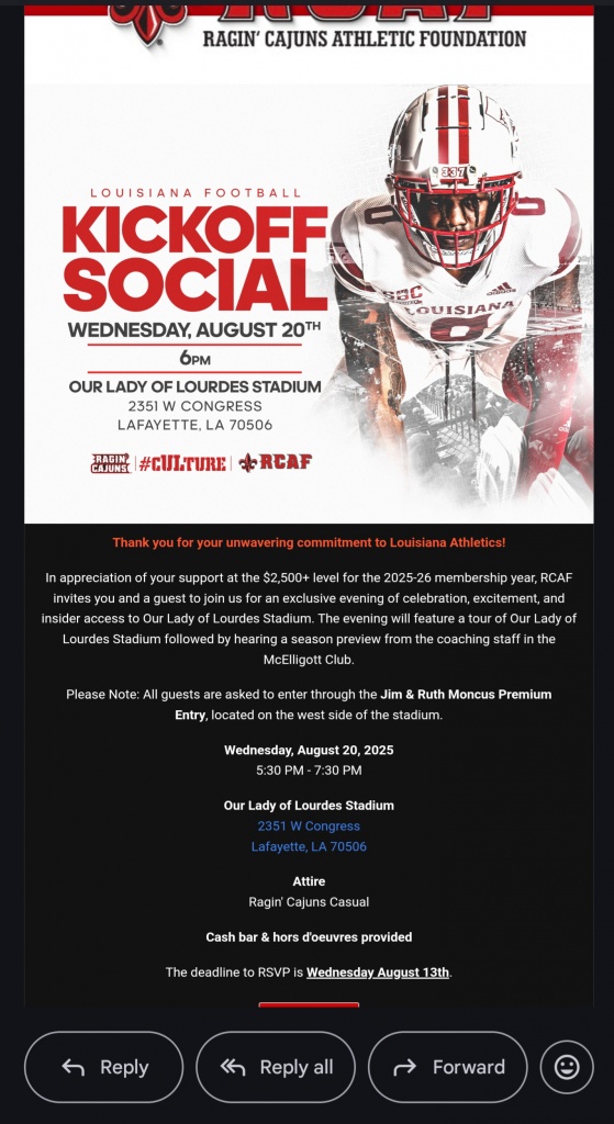 The Aug 20th social (note above) is for the general public and/or any one interested. Please spread the word. The prior event on 8/15 is invitation only to a certain higher level of donors. Two events collectively servicing all levels of supporters. cant wait for the 2025 season to kick off!!! Geaux Cajuns!