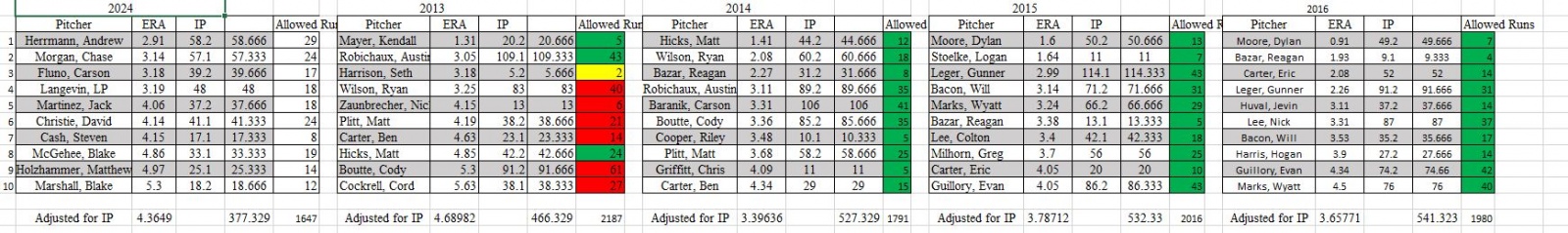 Once you get past the top 10 pitchers IP drops way off every year I would guess. So you could just copy and paste all those years off ragincajuns.com and see what you’re looking for…