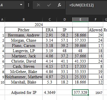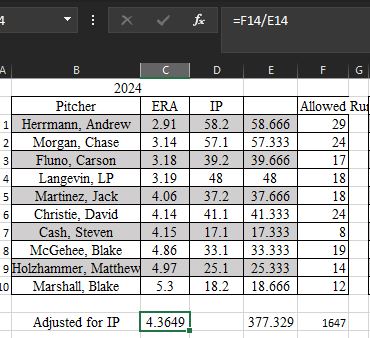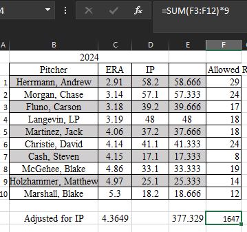 Then add up the earned runs those same guys have allowed…and multiply that number by 9. Then divide that number by the total innings number to get the combined ERA of those 10 pitchers.