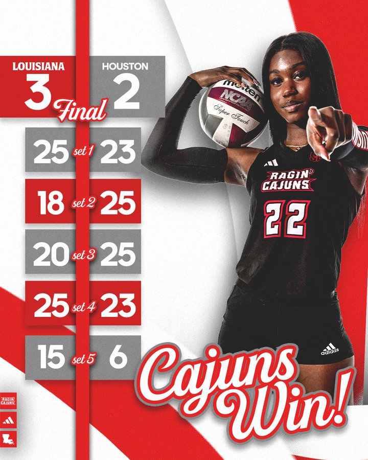 The Louisiana Ragin' Cajuns Volleyball team carried the momentum from forcing a fifth set over into the final frame and went on to claim a 3-2 (25-23, 18-25, 20-25, 25-23, 15-6) win over Houston on Thursday, September 5 in the opening match of the Flo Hyman Classic at the Feritta Center.
