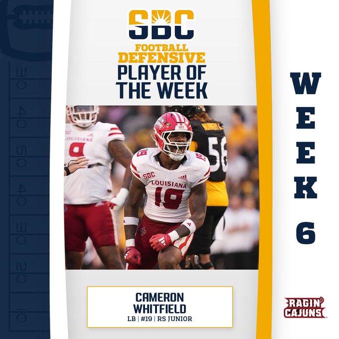 After tying a school-record with four sacks and helping lead Louisiana to its first win over Southern Miss in over 30 years, junior linebacker Cameron Whitfield was named the Sun Belt Conference Defensive Player of the Week, the league office announced on Monday.