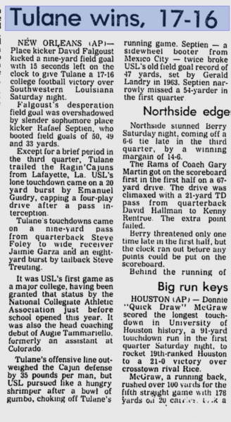 Kenny’s 60 yard near miss before halftime made me think: what is the record for longest made FG at UL? Surely the 60 would’ve broken it, but I don’t know the answer. I’m assuming it belongs to Baer, but I can’t find any information through google or our stats website. Btw, Kenny’s 53 yarder in the second half (which proved to be crucial) was a new career high for him.
