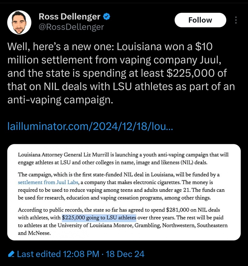 225K for LSU athletes with 56K split amongst other schools athletes. We would never know this if the media didn't publish it. That's why they ask the hard questions, whether coaches like it or not.