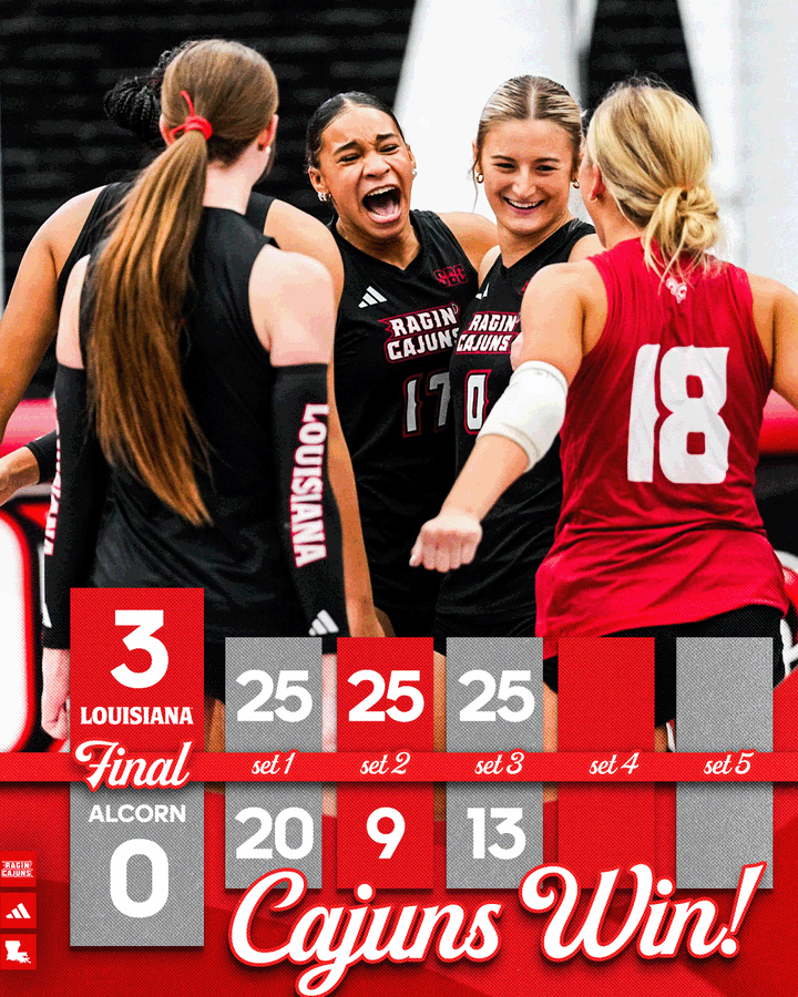 The Louisiana Ragin' Cajuns Volleyball team's offense became increasingly unstoppable as the match progressed, with hitting efficiency rising sharply each succeeding set, and the result was a 3-0 win (25-20, 25-9, 25-13) over Alcorn on Thursday, September 11 at the Davey L. Whitney Complex.
