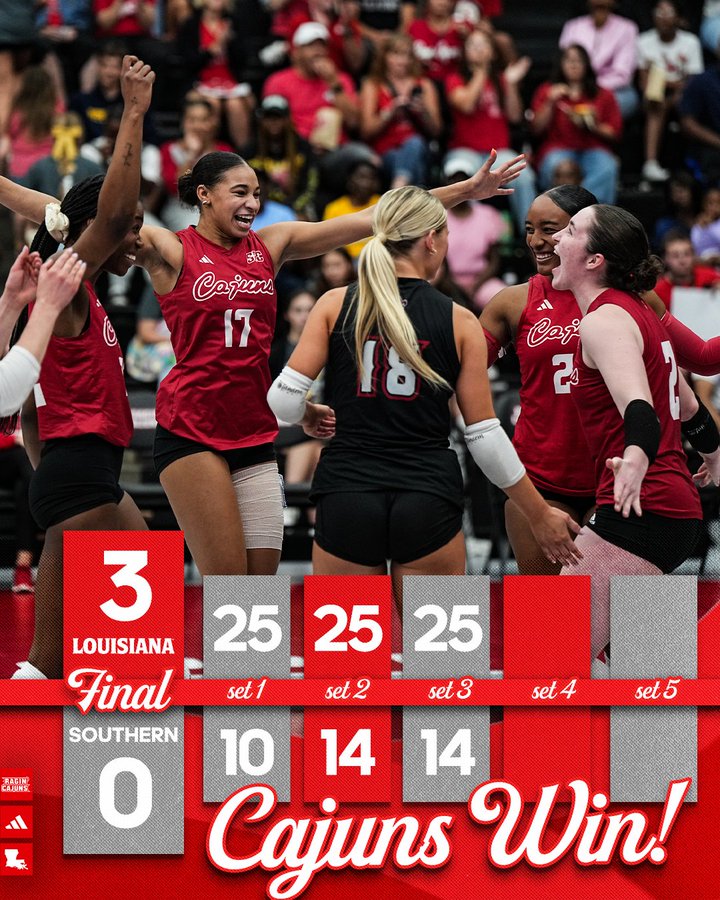 The Louisiana Ragin' Cajuns Volleyball team scored a kill on nearly half its swings, surging to a .388 hitting percentage, and received contributions from the entire 17-member roster in breezing past Southern in a 3-0 victory (25-10, 25-14, 25-14) on Friday, September 19 in the Ragin' Cajuns Classic at E.K. Long Gym