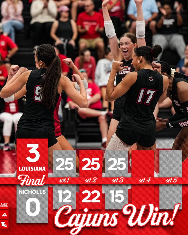 The Louisiana Ragin' Cajuns Volleyball team utilized several scoring options and controlled play with its service netting a 3-0 win (25-12, 25-22, 25-15) over Nicholls in the final match of the Ragin' Cajuns Classic on Saturday, September 20 at E.K. Long Gym.