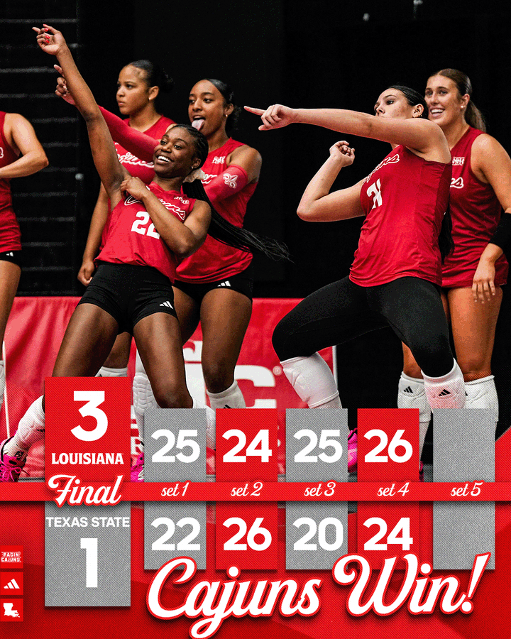 Louisiana Ragin' Cajuns Volleyball used its multiple scoring options to its advantage and captured a 3-1 win (25-22, 24-26, 25-20, 26-24) over Texas State in the Sun Belt Conference opener on Friday, September 26 at Strahan Arena in San Marcos, Texas.