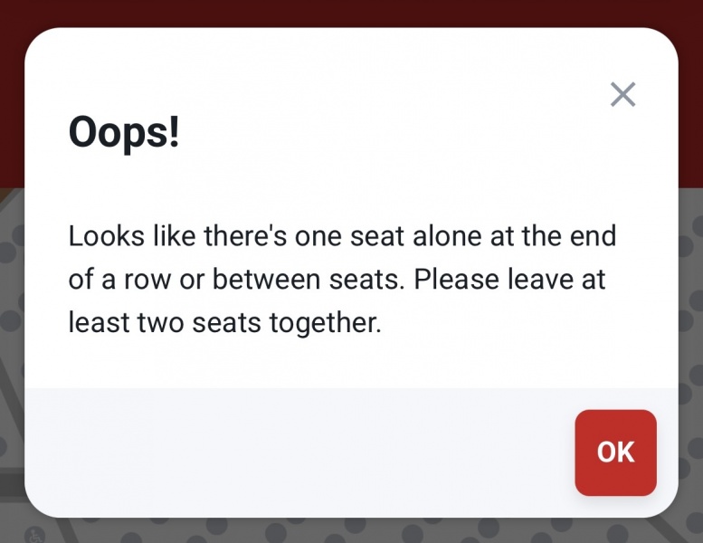 Trying to buy tickets for tomorrow and I keep getting this error message. Trying to buy 2 aisle seats, and seat 3 is empty. Seems rather ridiculous. Shouldn’t be ULLing this especially with the budget deficit.