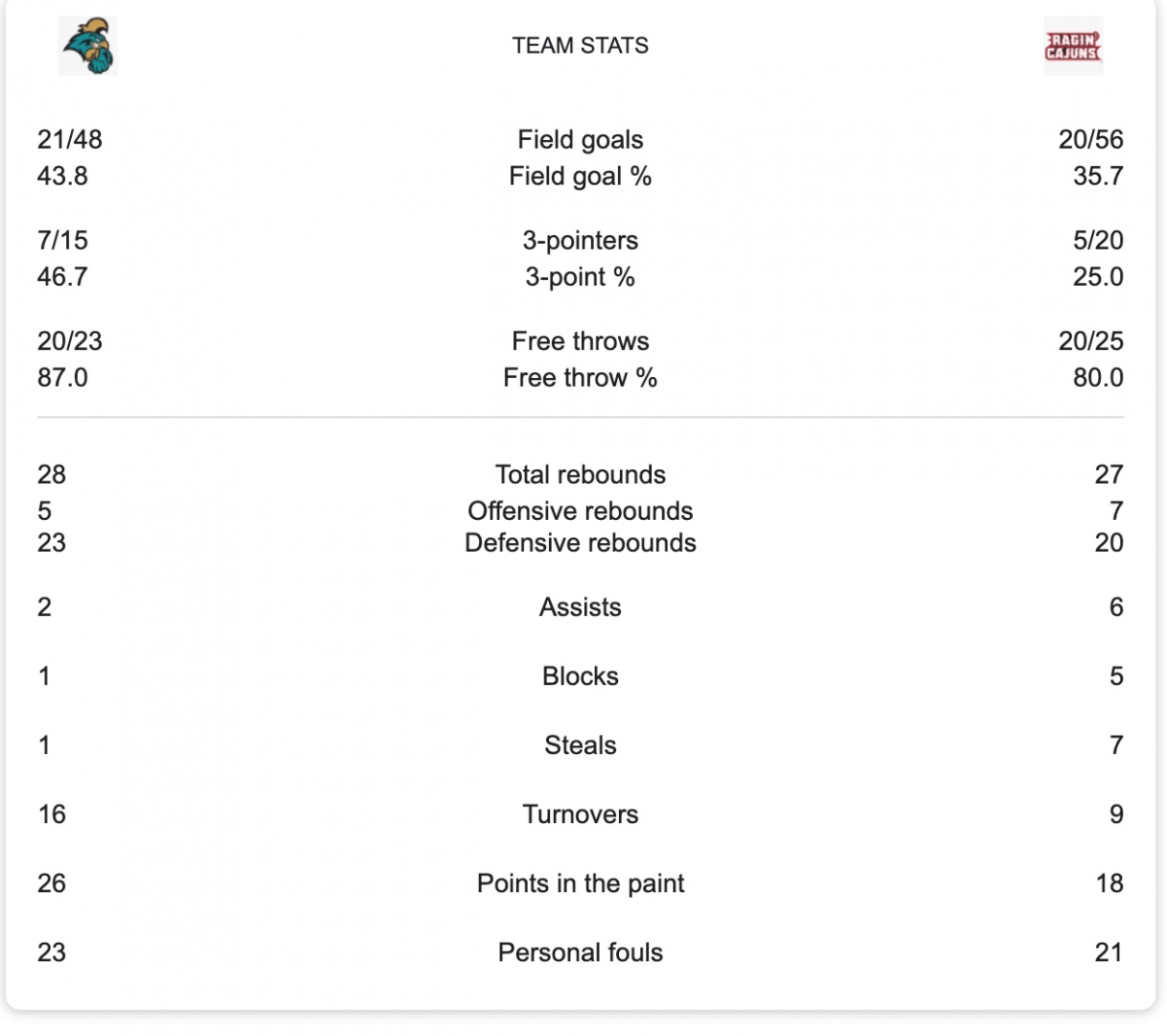 The loss ended a four-game winning streak for the Cajuns (9-17, 6-7 SBC), who were plagued by poor first-half shooting.