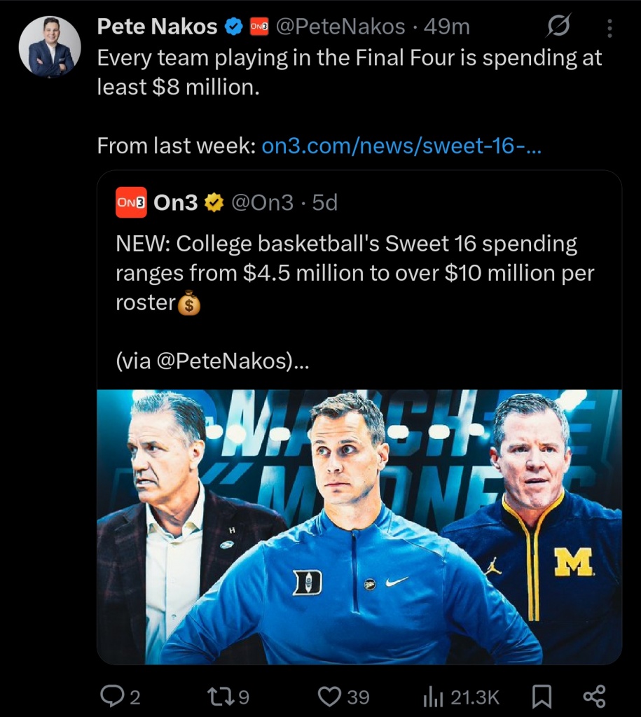 Looks like at least 2 of the 4 the final four teams seem ok without more money or fancy NIL players....short white guys the new moneyball perhaps?