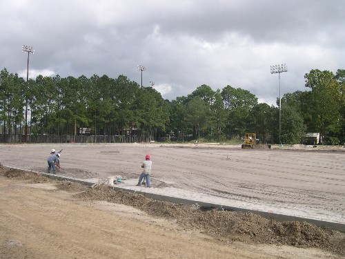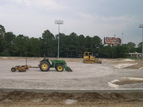 This photo and the two following ones were taken today, 18 Oct 2004. I had an opportunity to visit with Coach Lance Veazey, a very nice person who has a road map for the success of the track program. He said depending on the weather the contractor should begin laying the track surface around the end of Dec, and it should be completed around the end of January 2005. The key word is "weather".