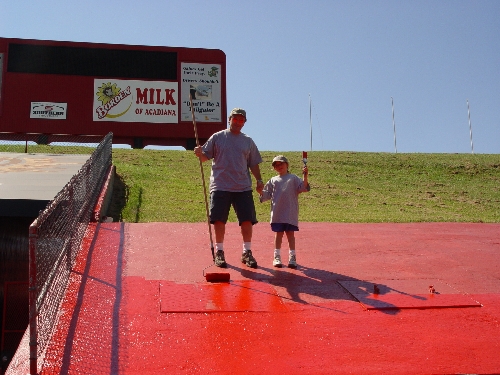 I woke up this morning and took a quick look at the paper and said, "What the !!!........." Well it was a nice article anyway. I think they could have done a little better than putting in a picture of Ole RedBug. I really had a good time. The weather was absolutely perfect, we had Judice Inn hambugers for lunch, and all 5 of my daughters were working. A lot was accomplished. I wanted to paint the rim around the field red. I was told that Bustle wants it black. It would be nice to get it painted either red or black and have sinage on it for the TV games.....