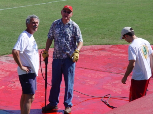 On Saturday, about 70 volunteers turned out to get the field and stadium in shape. Volunteers painted fresh coats of vermilion, trimmed hedges and pressure-washed where needed.