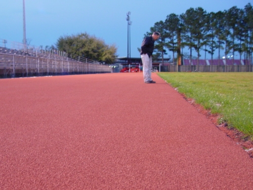 Stewart Blue --Universtity of Louisiana relay team and quarter mile track star from the 1960's-- checks out the surface of the new Ragin' Cajun track.